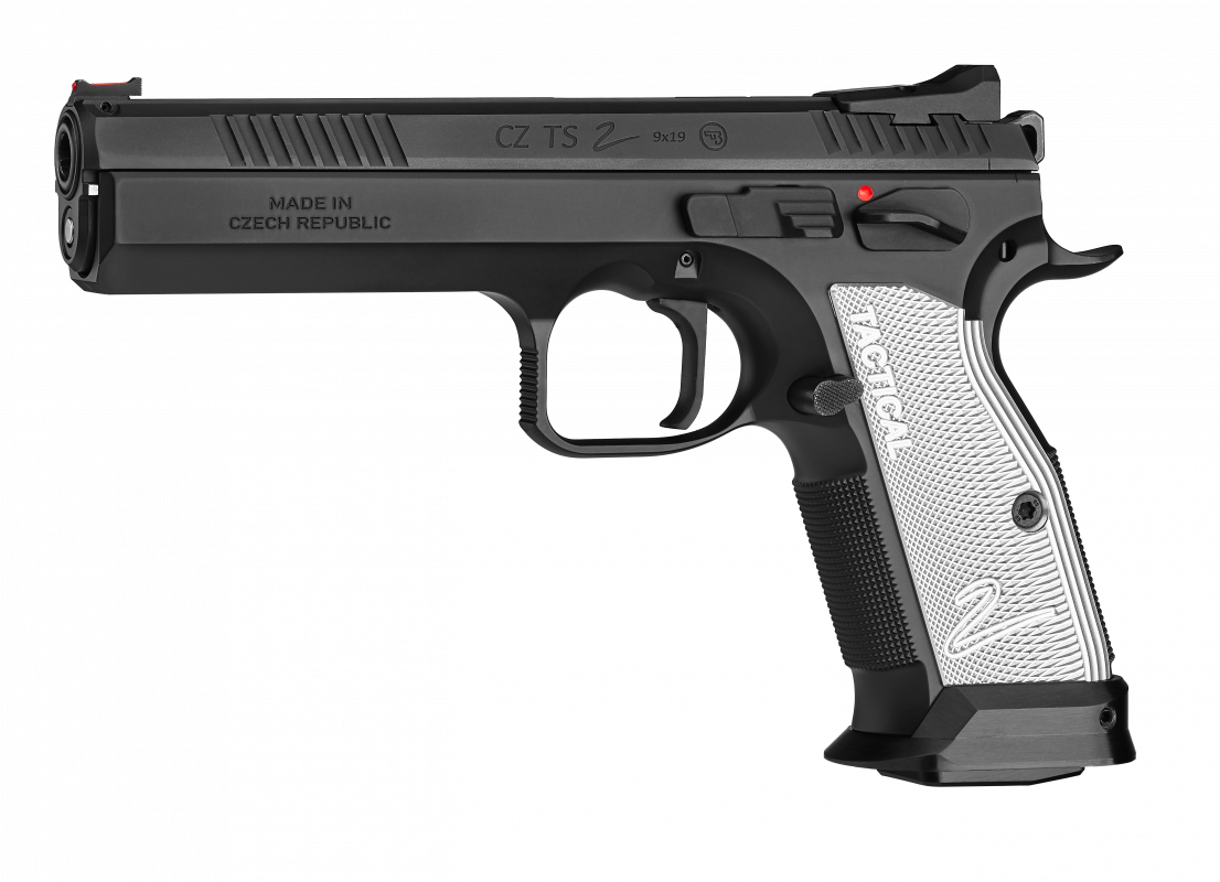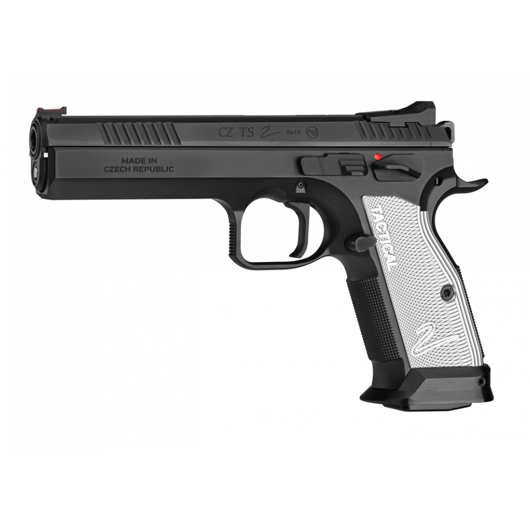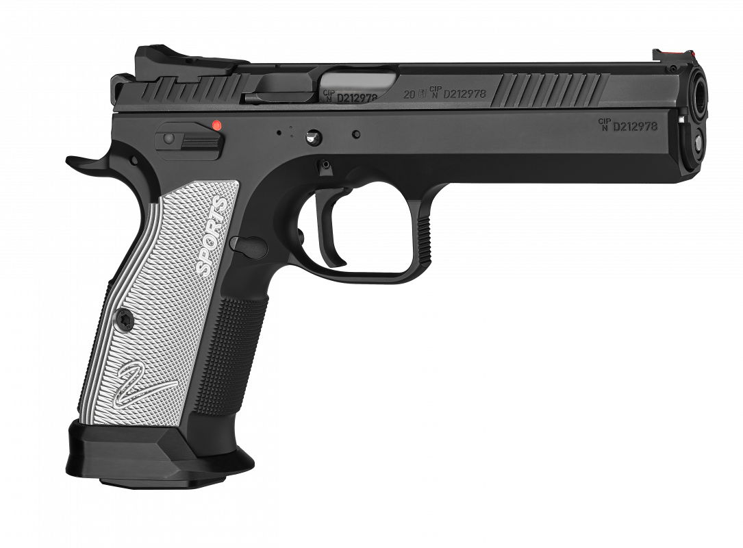 Base model of the new sport special for competing in the IPSC Standard Division or for target shooting. This model is equipped with flat, silver anodized duralumin grips, fixed metal sights and an extended, manual safety on the left side of the pistol (flat safety on the right side).